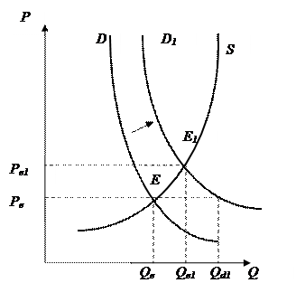 Предположим, что в результате моды кривая спроса сдвинулась в правую сторону. На какое-то время цена равновесия не изменится, что приведет к дефициту товара. Активный спрос стимулирует повышение цен, по мере роста цены активность спроса будет снижаться, пока не установится новая точка равновесия, т. е. произойдет рост производства при одновременном увеличении цен (рис. 9).