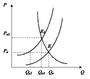 Предположим, что произошло подорожание сырья или государство ввело новые налоги. Вырастет себестоимость изготовления продукции, некоторые предприятия разорятся, объем предложения упадет, кривая S сдвинется в левую сторону. Это при равновесной цене Е приведет к дефициту продукции на рынке. Спрос будет больше предложения, цена начнет увеличиваться. В ответ на рост цен производители начнут расширять выпуск продукции, пока рынок не придет к новому равновесному состоянию Е1 при объеме Ре1 и объеме Qe1. Таким образом, способность рынка при помощи механизма спроса и предложения возвращаться в утраченное ранее равновесное состояние называется устойчивостью равновесия.