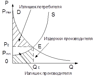 Рис. 11. Излишек потребителя, издержки и излишек производителя