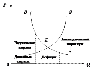 В условиях, когда цена находится ниже равновесного уровня, дефицит не ослабевает, а усиливается, к тому же к денежным затратам потребителя добавляются неденежные (рис. 12). Последние связаны с поисками товаров, стоянием в очередях и т. д. – все они являются омертвленными затратами, которые не служат расширению производства дефицитного товара. В случаях, когда цена выше равновесной, возникает необходимость дополнительных мер, стимулирующих ограничение предложения и увеличение спроса, чтобы сократить разрыв между субсидируемой и равновесной ценами. И в том и в другом случае рыночная экономика начинает функционировать менее эффективно, чем в условиях совершенной конкуренции.