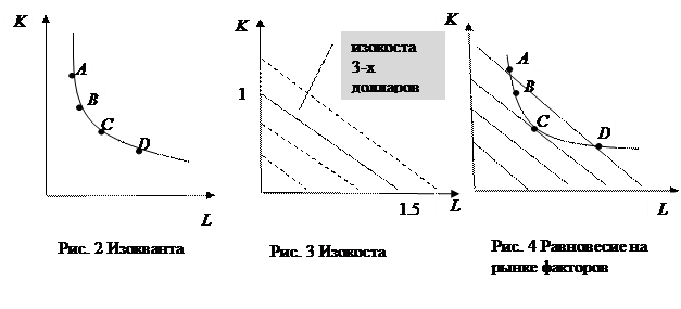 Изокосты строятся следующим образом. Допустим, цена единицы капитала — 3 долл., а единицы труда — 2 долл., как предполагалось ранее. Если весь бюджет предпринимателя составляет 3 долл., то, затратив все деньги только на капитал, он сможет купить 1 ед. этого фактора. Если же он затратит все деньги только на труд, то сможет приобрести 1,5 ед. труда. Теперь можно соединить две точки: одна из них лежит на оси ординат, т. е. 1 ед. капитала, другая — на оси абсцисс, т. е. 1,5 ед. труда. Эта линия — изокоста 3 долл. Каждая точка на этой линии показывает различные сочетания К и L, но общие расходы будут составлять одну и ту же величину — 3 долл.