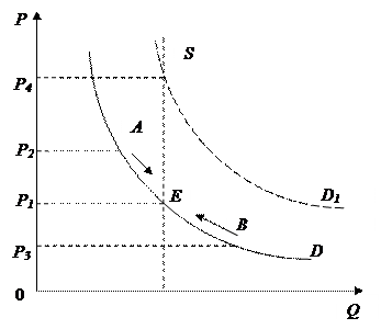 В том случае, если арендаторы будут предъявлять меньший спрос на землю, чем предлагают землевладельцы (точка А), то цена земли будет соответственно Р2, это значит, что некоторые землевладельцы не смогут сдать землю в аренду и, следовательно, понизят на нее цены до Р1. Если цена спроса на землю будет превышать цену предложения (точка В), то в результате повышенного спроса землевладельцы будут повышать цену с Р3 до Р1. Равновесная рыночная цена земли Р1 установится в точке Е.