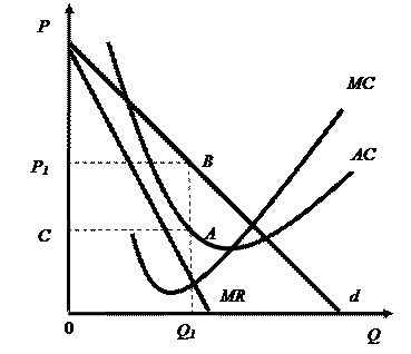 Для нахождения объемов продукции, дающих максимальную прибыль, находим точку пересечения MR и MC (точка A). Перпендикуляр, опущенный из точки A на ось абсцисс, показывает количество продукции Q 1, которое необходимо произвести для получения максимальной прибыли. Продолжение данного перпендикуляра вверх дает точку пересечения B с линией спроса d. Данная точка помогает определить, по какой цене Р1 возможно продать продукцию в количестве Q. Проекция точки на ось ординат показывает цену P1. Точка С отражает уровень средних затрат (АС). Площадь прямоугольника P1ВQ10 - это общая выручка (TR), получаемая фирмой-монополистом. Валовая выручка TR подразделяется на общие затраты и прибыль фирмы. Общие затраты зависят от средних затрат на единицу продукции и количества произведенной продукции (TC = ATC · Q). Если мы из общей выручки (TR) вычтем общие затраты (TC), то получим величину общей прибыли TP, которая измеряется площадью прямоугольника P1ВАС.