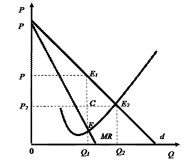 Ущерб, наносимый обществу монополией будет определяться площадью фигуры E1Е2Е. Причем площадь СEЕ2 составит потери покупателя, так как он сможет по цене P1 купить лишь Q1 единиц товара (вместо Q2 по цене P2). Наряду с этим монополия присвоит себе и ту часть доходов потребителя, которая соответствует площади прямоугольника P1Е1СP2, поскольку в условиях совершенной конкуренции излишек потребителя составила бы площадь треугольника P2Р0E2.