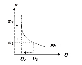 При классическом протекании экономического цикла, имевшем место до 70-х гг. ХХ в. спад производства сопровождался не ростом, а снижением цен. Это взаимодействие инфляции и безработицы графически иллюстрирует кривая Филлипса (рис. 1). График отражает ситуацию для краткосрочного периода, когда за счет повышения инфляции с уровня