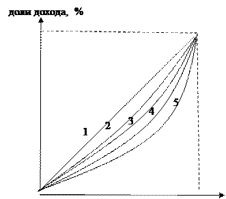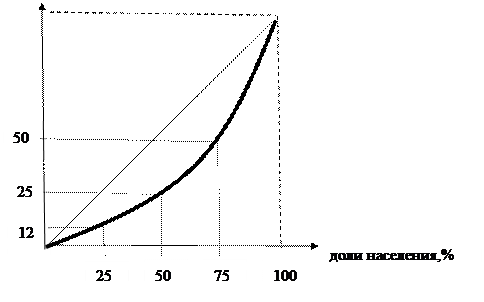 Для анализа степени дифференциации доходов используется несколько показателей. Графически неравенство в распределении доходов отражается с помощью кривой Лоренца. Для ее построения по горизонтальной оси откладывают процент семей, располагающих определенным уровнем дохода, а по вертикальной - долю совокупного дохода, приходящегося на соответствующую часть семей (рис. 1).