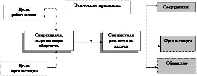 2. Общность интересов. Каждая организация имеет определенные социальные цели. Они формируются и ведут свою деятельность на основе определенной общности интересов их членов. Менеджерам необходимы работники для выполнения задач организации; сотрудники нуждаются в организации, так как она способствует достижению их личных целей. Как показано на рисунке 2, общность интересов определяет сверхзадачу организации, которая решается только объединенными усилиями работников и работодателей.