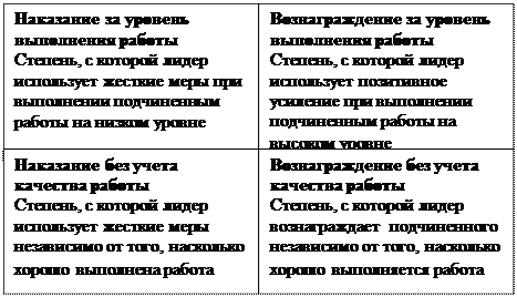 Концепция «вознаграждения и наказания». Концепция основана на положениях теории о закреплении поведения. В данной концепции лидер рассматривается в качестве человека, управляющего процессом изменения поведения подчиненных в желательном направлении. Концепция выделяет четыре типа лидерского поведения в зависимости от применения вознаграждения или наказания (рисунок 34)