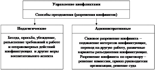 В зависимости от точки зрения на конфликт, которой придерживается менеджер, будет зависеть процедура его преодоления. В связи с этим выделяют две группы управления конфликтом: педагогические и административные (рисунок 44).