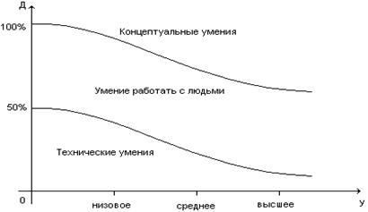 К наиболее значимым навыкам лидера обычно относят технические, человеческие и концептуальные. На рисунке 1.5.обозначены по горизонтальной оси уровни управления (У), а по вертикали - способности менеджера в процентах (Д).