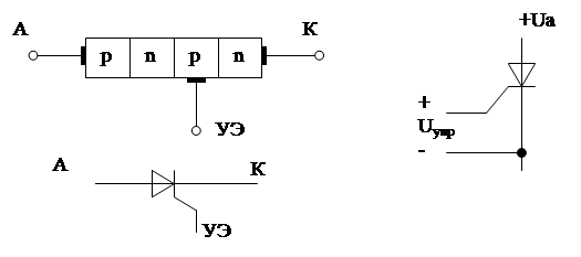 Тиристор имеет три вывода анод А, катод К и управляющий электрод УЭ. Если к аноду приложено положительное относительно катода напряжение, то переходы I и III открыты, а переход II закрыт. При подаче на управляющий электрод положительного относительно катода напряжения произойдет открытие перехода II, вследствие этого тиристор откроется.
