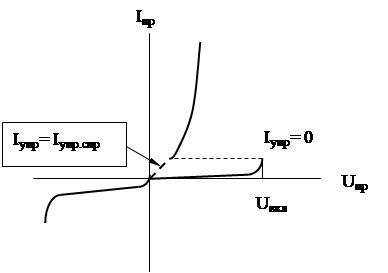При токе управления, равном нулю, тиристор может открыться при большой величине прямого напряжения Uвкл. Однако такой режим работы нежелателен, поэтому в практических схемах применяют тиристоры, величина прямого напряжения самопроизвольного открывания которых больше любого возникающего в схеме напряжения. С ростом тока управления напряжение открывания уменьшается, и при некотором токе управления, называемым током спрямления Iупр.спр, напряжение открывания уменьшается настолько, что вольтамперная характеристика тиристора становится похожей на ВАХ диода (спрямляется).