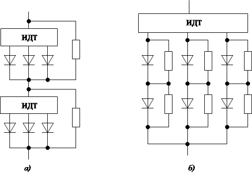 При параллельном соединении последовательных цепочек можно устанавливать только один ИДТ на всю схему, но для обеспечения равномерного распределения обратного напряжения между последовательно включёнными полупроводниковыми приборами придётся устанавливать Rш на каждый диод или тиристор.