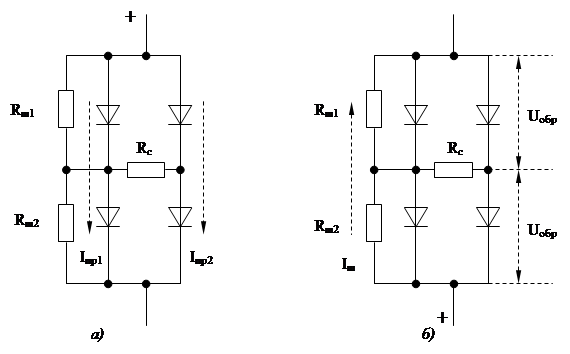 При протекании прямого тока сопротивление резистора связи большое по сравнению с прямым дифференциальным сопротивлением полупроводникового прибора (Rc>>Rд), и прямые токи равномерно распределяются между параллельными цепочками. При приложении обратного напряжения и протекании обратных токов сопротивление резистора связи весьма малое по сравнению с обратными сопротивлениями (Rc<<Rобр.min), и обратное напряжение на всех параллельно соединённых через Rc полупроводниковых приборах выравнивается. Следует учесть, что величина сопротивления резистора Rш в схеме с резисторами связи должна быть уменьшена во столько раз, сколько последовательных цепочек включено параллельно, т.е.
