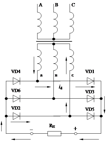 Схема шестипульсового мостового выпрямителя представлена на рис. 3.11. В схеме три вентиля (VD2, VD4, VD6) объединены в катодную группу, а три других (VD1, VD3, VD5) – в анодную. В любой момент времени ток проводят два вентиля – один в анодной и один в катодной группе. На схеме указано направление тока i d для случая, когда наибольшее положительное напряжение на фазе а, наибольшее отрицательное напряжение на фазе с, ток проводят вентили VD1 и VD2. Очерёдность вступления в работу остальных вентилей соответствует их номерам. В схеме используется выпрямительный агрегат ПВЭ-5.