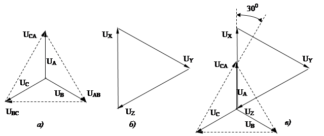 Рис. 3.15. Получение сдвига фаз 300 Эл при совместной работе двух вторичных обмоток, включённых по схеме «звезда» и «треугольник»: