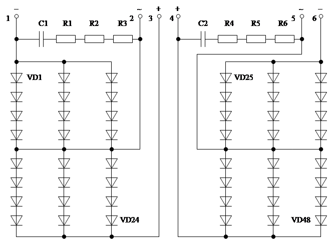 В комплект выпрямителя входят шесть шкафов с диодами, в каждом шкафу установлено по 48 диодов. Принципиальная электрическая схема одного шкафа представлена на рис. 3.18.