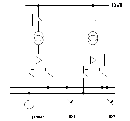 Рис. 6.3. Упрощённая однолинейная схема ТП с двумя выпрямительными агрегатами