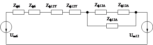 Для определения величины общего сопротивления фаз вторичных обмоток трансформаторов шести и двенадцати пульсового выпрямителей составим эквивалентную схему (рис. 6.6).