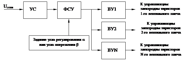 Устройство синхронизации УС служит для получения импульсного сигнала при каждом переходе каждой из трёхфазных синусоид через ноль (синхронизации импульсов управления с частотой питающей сети). Фазосдвигающее устройство ФСУ формирует по сигналу «Задание угла регулирования» необходимую величину a или b (соответствующее фазовое положение управляющего импульса). Выходные устройства ВУ1, ВУ2, …, ВУN формируют управляющие импульсы для тиристоров в соответствии с необходимыми величинами U упр, I упр и dIупр/dt и подают их на соответствующее вентильное плечо преобразователя.