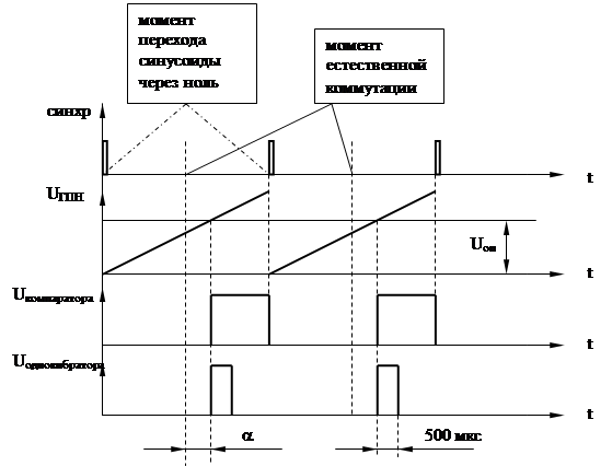 Генератор пилообразного напряжения выполнен на транзисторе VT1 и интегрирующей цепочке R1C1. Коротким импульсом «синхр» с выхода УС транзистор VT1 открывается и быстро разряжает конденсатор С1. Когда транзистор закрывается, конденсатор С1 начинает медленно заряжаться через резистор R1. Напряжение на конденсаторе нарастает практически линейно. Пока напряжение на конденсаторе С1 меньше порогового, установленного резистором R2, на выходе компаратора DA1 напряжение близко к нулю. Как только напряжение на С1 становится равным пороговому, компаратор переключается, и на одновибратор поступает высокий уровень напряжения. Одновибратор вырабатывает одиночный импульс длительностью около 500 микросекунд. Длительность этого импульса должна быть больше длительности процесса коммутации вентильных токов. Импульс с выхода одновибратора поступает на выходные устройства ВУ1…ВУN. Временная диаграмма работы ФСУ представлена на рис. 9.5.
