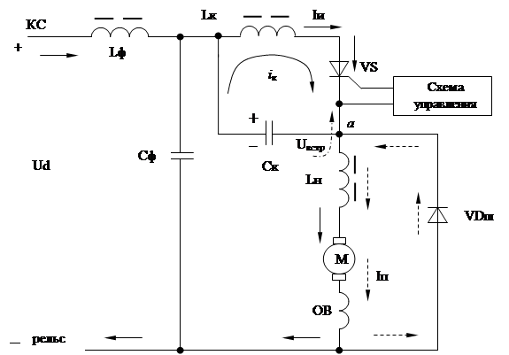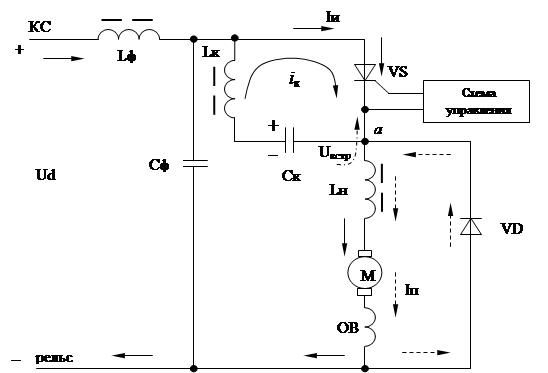 Когда тиристор VS закрыт, конденсатор Ск заряжается до напряжения Ud от контактной сети через Lф, Lк, Lн и тяговый двигатель М в полярности «+» на левой обкладке, «-» - на правой. Как только тиристор VS открывается, в коммутирующем контуре LкCк появляется ток i к, протекающий по цепи Lк, VS, Cк. Этот ток через половину периода колебаний