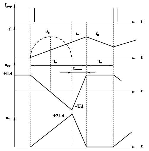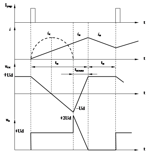 Рис. 10.6. Временная диаграмма работы одно операционного импульсного регулятора с включением катушки коммутирующего контура Lк последовательно с тиристором