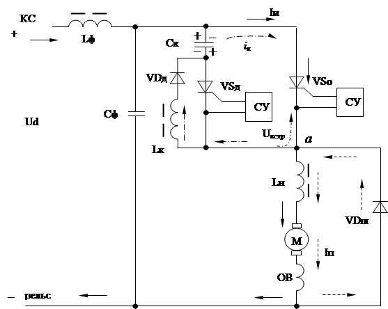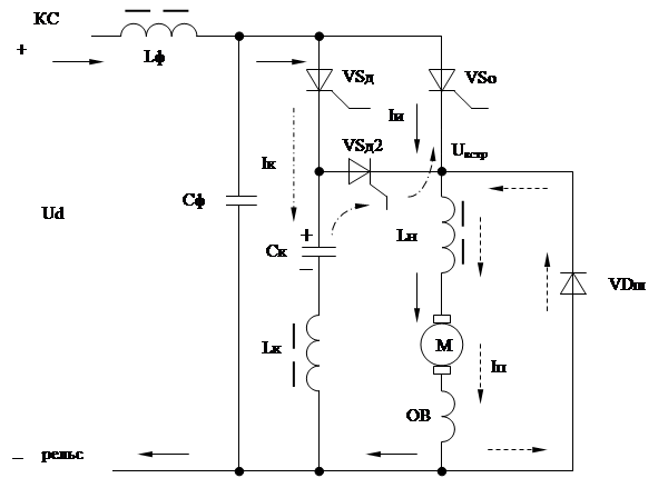 Коммутирующий контур содержит элементы Lк, Cк, VDд и VSд. Конденсатор Ск при закрытом основном тиристоре VSо предварительно заряжается до напряжения Ud от контактной сети через Lф, VSд, Lн и тяговый двигатель М в полярности «+» на верхней обкладке, «-» - на нижней. Как только тиристор VSо открывается, в коммутирующем контуре LкCк появляется ток i к, протекающий по цепи VSо, Lк, VDд, Cк. Этот ток через половину периода колебаний