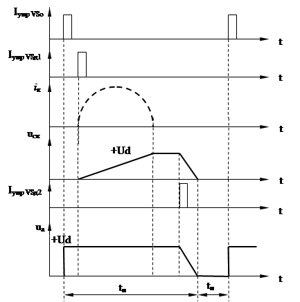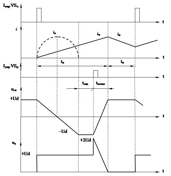 перезаряжает конденсатор Ск в противоположной полярности «-»на верхней обкладке, «+» - на нижней. Ток в коммутирующем контуре прекращается, а тиристор VSо остаётся открытым до тех пор, пока система управления не откроет дополнительный тиристор VSд. При открывании VSд на тиристор VSо будет подано встречное напряжение с нижней обкладки конденсатора Ск, и тиристор VSо закроется. Тиристор VSд будет оставаться открытым до тех пор, пока конденсатор Ск не перезарядится до напряжения Ud в полярности «+» на верхней обкладке, «-» - на нижней. Тогда ток в цепи прекратится, и тиристор VSд закроется. Схема придёт в исходное состояние.