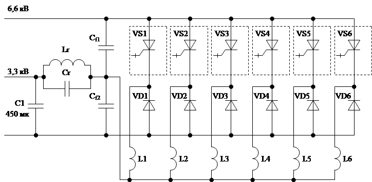 Выравнивание статического распределения напряжений на тиристорах осуществляется с помощью резисторов, включенных параллельно тиристорам.