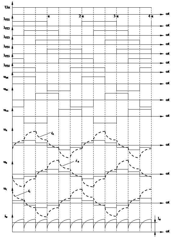 Рис. 11.9. Временная диаграмма работы трёхфазного мостового автономного инвертора напряжения