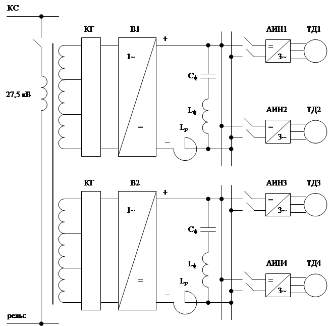 КГ – групповой коммутатор, В1 и В2 – однофазные выпрямители, АИН – автономные инверторы напряжения, ТД – тяговые асинхронные трёхфазные двигатели