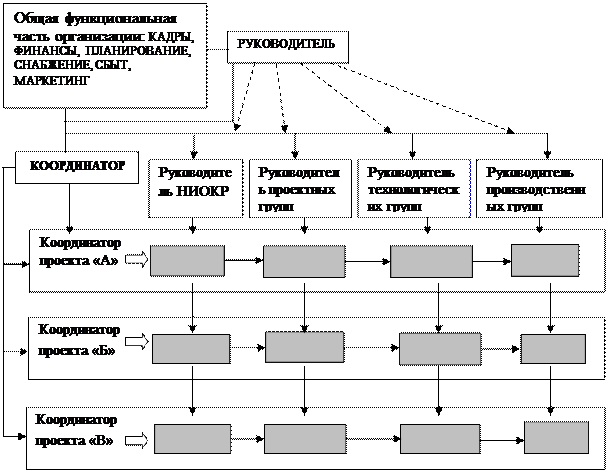При такой организации руководитель проекта взаимодействует с двумя группами подчиненных: с членами проектной группы и с другими работниками функциональных подразделений, подчиняющимися ему временно и по ограниченному кругу вопросов (причем сохраняется их подчинение непосредственным руководителям подразделений - отделов, служб).