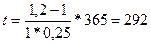 Пример 6. Какова должна быть продолжительность ссуды в днях для того, чтобы долг, равный 1 млн. рублей, вырос до 1,2 млн. рублей при условии, что начисляются простые проценты по ставке 25% годовых (К = 365)?
