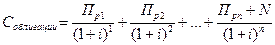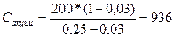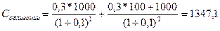Пример 36. Рассчитайте стоимость облигации, срок до погашения которой 2 года, номиналом 1000 рублей, ежегодный процент 30%, процентная ставка 10%.