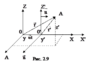 (рис. 2.9). Пусть в начальный момент времени t = 0 системы отсчета совпадают. При движении системы отсчета Х`Y`Z`, радиус-вектор материальной точки в момент времени t в системе X,Y,Z равен