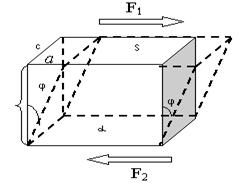 силы F1 и F2 приложены параллельно противоположным граням площадью S прямоугольного стержня вызывают деформацию сдвига (рис 2.16).