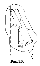 При отклонении тела от положения равновесия возникает момент силы тяжести М=mglsinα, где l – расстояние между точкой подвеса О и центром инерции С (рис.3.9).