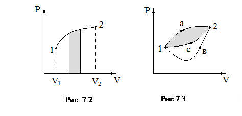 Переход ТС из одного равновесного состояния в другое изображается линией. Работа dА, совершенная ТС при изменении ее объема на dV, равна площади заштрихованной полоски (рис 7.2.). Полная работа перехода ТС из первого положения во второе А1,2 равна площади криволинейной трапеции под кривой 1,2. Работа зависит от направления перехода системы из одного состояния в другое. Так, если ТС переходит из состояния 1 в состояние 2 один раз по пути а), а другой по пути b (рис. 7.3), то А1a2