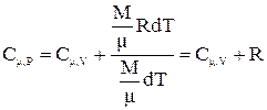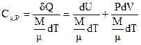Теплоемкость при постоянном давлении определяется для изобарического процесса, при котором обмен энергией происходит и в форме работы, и в форме теплопередачи. Подводимое к газу тепло затрачивается на изменение внутренней энергии газа и на совершение им работы.