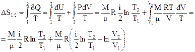 В изохорическом процессе количество приведенного тепла δQ/T=dU/T. Следовательно изменении энтропии при переходе системы из состояния с температурой T1 в состояние с температурой T2