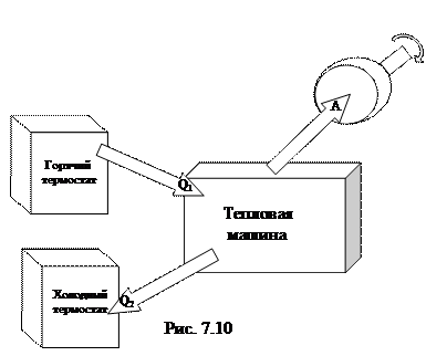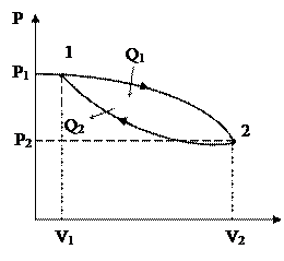 Тепловая машина (ТМ) состоит из рабочего тепла, горячего и холодного термостата, механического привода совершающего работу (рис 7.10). Рабочее тело (газ) объемом V1 и давлением Р1 расширяется до объема V2 и давления Р2 при постоянной температуре T1 (рис 7.11). Для поддержания постоянной температуры из горячего термостата газу передается количество тепла Q1. Чтобы газ вернуть в первоначальное состояние газ сжимается при температуре Т2 <Т1 с отведением количества тепла Q2 в холодный термостат. Процесс, проходящий в рабочем теле в