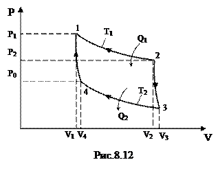 В тепловой машине работающей по циклу Карно реализованы два адиабатических (2-3)(4-1) и два изотермических (1-2)(3-4) процесса (рис 8.12).