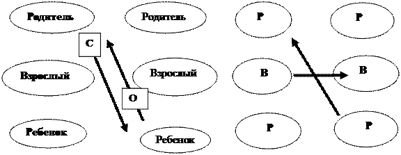 Некомлиментарные, или пересекающие трансакции изображаются пересекающимися линиями стимула и ответной реакции. Перекрестные трансакции могут заблокировать процесс, что предопределяет неудовлетворительный результат коммуникаций и конфликт.
