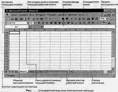 Панели инструментов – значки, кнопки, раскрывающиеся списки, благодаря которым возможен быстрый доступ к часто используемым командам и настройкам. По умолчанию, если не сделано определенных установок, Excel выводит на экран Стандартную панель инструментов и Панель форматирования. Чтобы узнать название кнопки или пиктограммы, нужно подвести к ней указатель мыши – Excel выдаст подсказку, чтобы получить полную информацию о назначении кнопки, можно воспользоваться справкой –?.