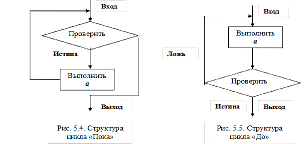 Цикл «Пока» начинается с проверки логического выражения. Если оно истинно, то выполняется «Выполнить а», затем все повторяется снова, пока логическое выражение сохраняет значение «истина». Как только оно становится ложным, управление передается по программе дальше (см. рис. 5.4).