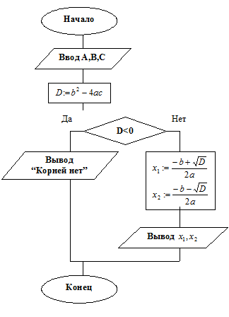 Еще один классический пример: «По заданным коэффициентам решить квадратное уравнение». Эта задача сложнее, поэтому перед тем как писать программу составим алгоритм, записав его в виде блок-схемы.