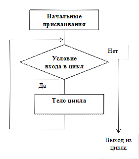 Группа операторов, называемая «телом цикла», судя по этой схеме, будет выполняться пока истинно условие цикла. Выход из цикла произойдет, когда условие станет ложным.
