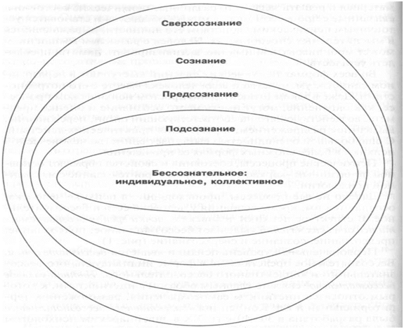 Далеко не все процессы, происходящие в психике человека, осознаются им, кроме сознания у человека есть и бессознательное. В структуре психики человека с точки зрения осознаваемости психических явлений выделяют бессознательное, подсознание, предсознание, сознание и сверхсознание (рис. 1).