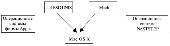 На начальных этапах фирма Apple, основанная Стивом Джобсом (Steve Jobs), применяла операционную систему с общим именем System. Эта же фирма выпустила UNIX-подобную ОС AUX для процессоров Motorolla. Покинув фирму, Джобс создавал операционную систему NeXTSTEP, а вернувшись в Apple – собственную ОС, названную Mac OS X. Она использовала исходные коды 4.4BSD UNIX. В новой системе применены идеи макроядра Mach 3.0. Естественно, Mac OS X создавалась с учетом опыта предыдущих разработок, в которых принимал участие Джобс (рис. 2.8).